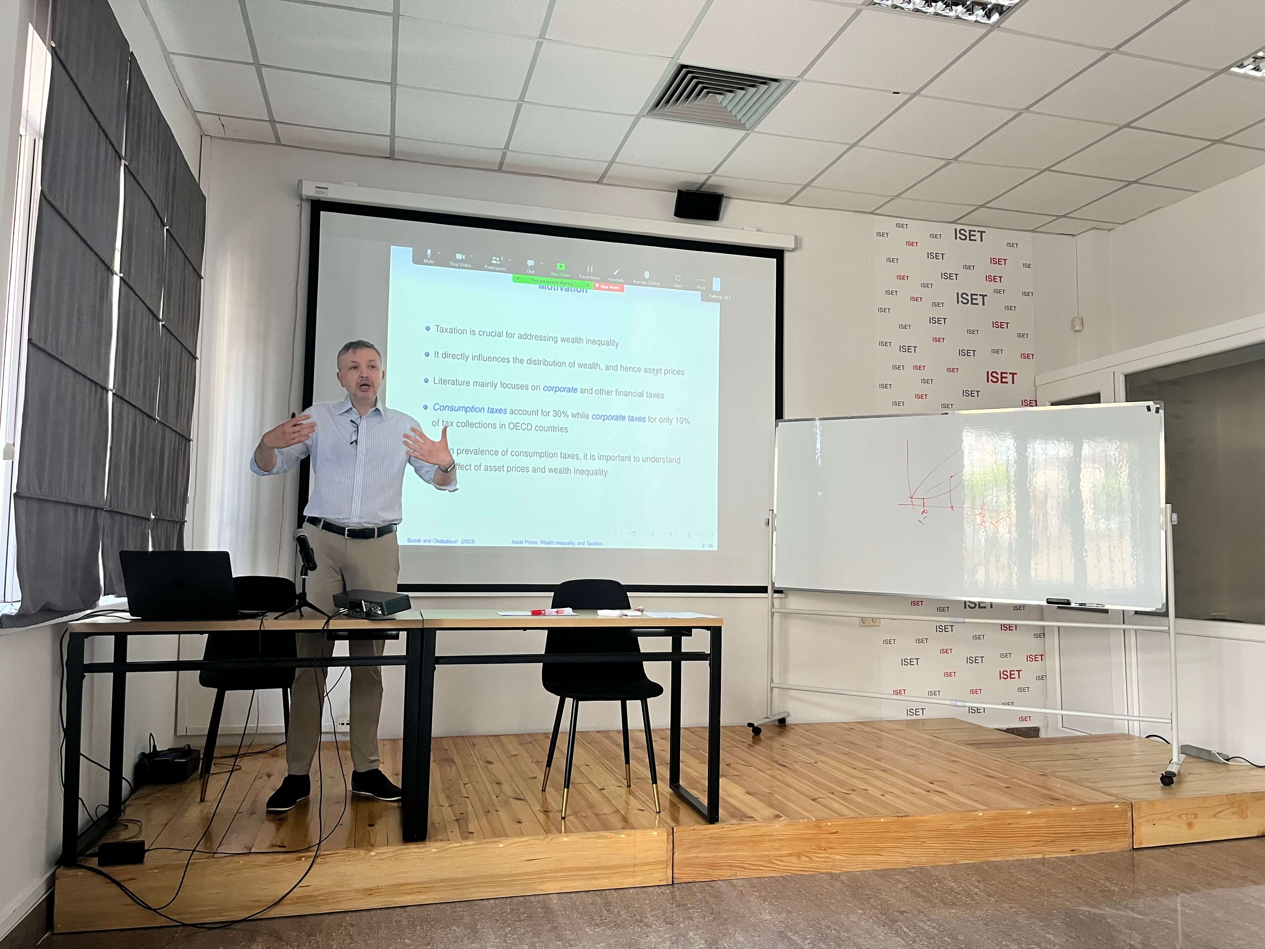 Nikoloz Pkhakadze (ISET) commenced the conference by presenting his joint work with A. Anderson titled “Polarizing Persuasion.” He explained a Bayesian persuasion model with one sender and two receivers and explored the incentives and abilities of the sender to polarize receivers. Next, “Asset Prices, Wealth Inequality, and Taxation,” a joint work with S. Basak, was presented by Georgy Chabakauri (LSE). Georgy talked about the interplay between the valuation of assets and wealth inequality and argued that taxation alleviates wealth inequality but does not address the extreme concentration of wealth. Nino Kodua (Johns Hopkins University) presented her work “Inflation Targeting in Emerging Markets: Breaking the Inflation Spell or a Statistical Fallacy of Regression to the Mean?” She discussed the mixed empirical evidence on the effectiveness of inflation targeting and proposed a new empirical setting to estimate the relationship between the adoption of inflation targeting and subsequent inflation. Givi Melkadze (Georgia State University) concluded the morning sessions by shifting the audience’s attention to climate policies. He presented “Carbon Taxes and Tariffs, Financial Frictions, and International Spillovers,” – a joint study with S. Carattini, G. Kim, and A. Pommeret, that explores climate policy-related financial stability risks and their implications for the design of the macroprudential policy. Givi emphasized that properly designed macroprudential policies can mitigate such risks paving the way for ambitious climate policy action.